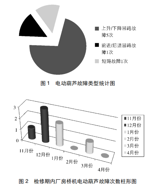 通過對 2013—2014 年檢修期電動葫蘆故障類型統(tǒng)計( 圖 1) 及檢修期內(nèi)廠房橋機電動葫蘆故障次數(shù)柱形圖( 圖 2) 的調(diào)查分析得出: 上升/下降控制回路故障次數(shù)為5 次,前進/后退控制回路故障 1 次,短路故障 1 次。由此可見,電動葫蘆控制回路的可靠性有待進一步提高。