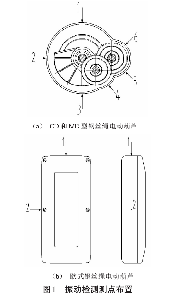 傳感器可放置在軸承座或基座上任意角度位置,對(duì)于鋼絲繩電動(dòng)葫蘆,通常在減速器殼體的水平或豎直方向放置傳感器。對(duì)于常用的CD和MD型鋼絲繩電動(dòng)葫蘆,振動(dòng)檢測(cè)的測(cè)點(diǎn)位置如圖1(a)所示,點(diǎn)1點(diǎn)2為兩個(gè)相互正交方向;點(diǎn)3點(diǎn)4由于減速機(jī)中2軸的設(shè)計(jì)位置,可成45°放置;點(diǎn)5點(diǎn)6為兩個(gè)相互正交的方向。歐式鋼絲繩電動(dòng)葫蘆的測(cè)點(diǎn)位置如圖1(b)所示,在減速器的頂端垂直方向設(shè)置點(diǎn)1,在減速器的水平方向設(shè)置點(diǎn)2,點(diǎn)1和點(diǎn)2相互正交。如果是單通道傳感器檢測(cè),建議采用點(diǎn)1、點(diǎn)2、點(diǎn)3和點(diǎn)6分別檢測(cè),保證檢測(cè)的周向全面性對(duì)于歐式鋼絲繩電動(dòng)葫蘆,可分別對(duì)點(diǎn)1、點(diǎn)2進(jìn)行測(cè)量,保證正交方向檢測(cè)。
