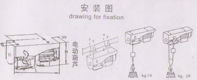固定微型電動葫蘆需要使用六角頭螺栓、平墊圈、彈簧墊圈等附件。要確保各位件正確安裝,并用力矩扳手將螺栓緊固,“安裝圖”。要確保固定環(huán)(或其它代替件)緊緊壓住安裝桿(圓桿或方桿),使微型電動葫蘆機身不能沿安裝桿移動或轉(zhuǎn)動。