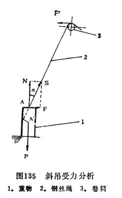 根據(jù)力的分解法則,可以將拉力S分解為一個(gè)垂直的分力N和水平分力F。由圖可見,S>N,因?yàn)橐驨=P,所以S>P。即斜吊時(shí)鋼絲繩的拉力要比重物的重量大,而且斜吊角α越大,S也越大。斜吊會(huì)產(chǎn)生超負(fù)荷,就是這個(gè)道理。
