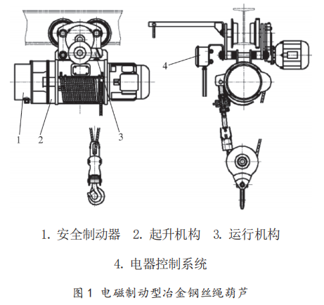 電磁制動(dòng)或機(jī)械制動(dòng)屬于安全制動(dòng)器的范疇,此類(lèi)冶金電動(dòng)葫蘆類(lèi)似于傳統(tǒng)的CD、MD型鋼絲繩電動(dòng)葫蘆,整機(jī)串聯(lián)結(jié)構(gòu),包含起升機(jī)構(gòu)、運(yùn)行機(jī)構(gòu)和電器控制系統(tǒng)。
