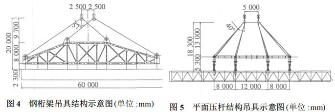 2、采用平面壓桿結(jié)構(gòu)(圖5),使吊具結(jié)構(gòu)高度降低,吊索具重量減輕。通過(guò)計(jì)算,當(dāng)?shù)跛骶呖偢邽?8.3m時(shí),外側(cè)吊索的豎向夾角為40°,吊索角度合理,吊索直徑較小,吊索具總重約為170t,浮吊吊重富余120t,吊高富余大2.7m。吊裝安全性大幅提高。