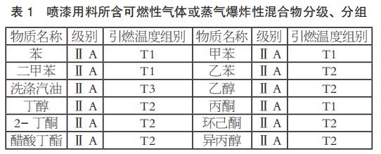 爆炸性氣體環(huán)境電力裝置設(shè)計(jì)前要有爆炸危險(xiǎn)區(qū)域劃分圖,對于簡單或小型廠房,可采用文字說明表達(dá)?!锻垦b作業(yè)安全規(guī)程 涂漆工藝安全及其通風(fēng)凈化》(GB 6514-2008)明確了封閉或半封閉涂漆工藝裝備內(nèi)部為 1 區(qū)爆炸性危險(xiǎn)區(qū)域,其開敞面以外,水平距離 3m,垂直距離 1m 以內(nèi)的空間區(qū)域劃為 2 區(qū)爆炸性危險(xiǎn)區(qū)域。按照《爆炸危險(xiǎn)環(huán)境電力裝置設(shè)計(jì)規(guī)范》(GB 50058-2014)的強(qiáng)制性條文,選擇隔爆型(“d”)結(jié)構(gòu)符合 1 區(qū)爆炸性危險(xiǎn)區(qū)域的要求,防爆電動(dòng)葫蘆采用了隔爆電動(dòng)機(jī)、隔爆電氣控制柜和隔爆按鈕。噴漆用料所含可燃性氣體或蒸氣爆炸性混合物分級、分組見表1。