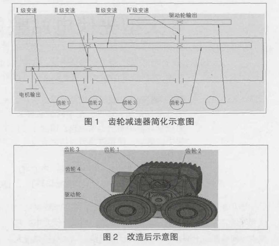 齒輪減速器可簡化為如圖1所示。要提升驅(qū)動(dòng)力的輸出轉(zhuǎn)速,有4種更改方法可以實(shí)現(xiàn):1、改變I級(jí)減速比,增大齒輪1,減小齒輪2;2、改變II級(jí)減速比,減小齒輪2,增大齒輪3;3改變III級(jí)減速比,增大齒輪3,減小齒輪4,;4改變IV級(jí)減速比,減小齒輪5,增大驅(qū)動(dòng)輪。