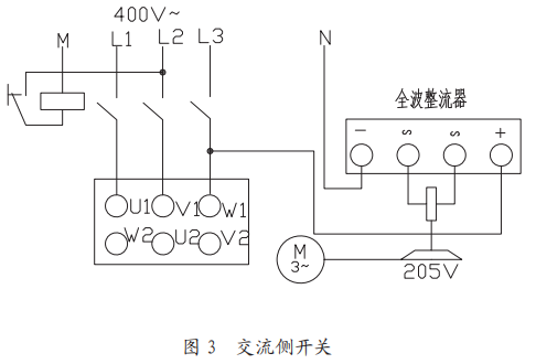 (3)由交流電源供電,由整流模塊轉(zhuǎn)換為直流電給制動器供電。通常情況下,制動器連接交流側(cè)開關(guān),與電動機(jī)同時(shí)得電、同時(shí)失電,通過電動機(jī)開關(guān)控制,交流測開關(guān)控制如圖3所示;為了實(shí)現(xiàn)快速制動,一般采用直流側(cè)開關(guān),直流側(cè)開關(guān)控制直接有電控控制,與電動機(jī)之間獨(dú)立控制,可以實(shí)現(xiàn)與電動機(jī)之間的時(shí)序控制,直流側(cè)開關(guān)的吸合時(shí)間比較側(cè)吸合時(shí)間快約6-10倍。