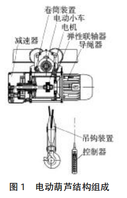 電動葫蘆通常稱為電葫蘆,是一種常見的輕小型的起重設(shè)備。常見電動葫蘆的控制方式有兩種,一是使用按鈕在地面跟隨操作,二是在司機室內(nèi)操控或采用無線遠距離控制。電動葫蘆一般由電機、傳動機構(gòu)和卷筒裝置或鏈輪機構(gòu)組成。電動葫蘆可以分為鋼絲繩電動葫蘆和環(huán)鏈電動葫蘆兩種。鋼絲繩電動葫蘆可以分為鋼絲繩電動葫蘆和環(huán)鏈電動葫蘆兩種。鋼絲繩電動葫蘆又可以分為單速提升型、雙速提升型、微型電動葫蘆、卷揚機、多功能提升機等多種類型?;S常用電葫蘆為微型電動葫蘆或懸臂葫蘆,往往在加料或維修車間頻繁進行檢維修作業(yè)的固定點位安裝,設(shè)備拆裝位置因綜合考慮現(xiàn)場空間安全和建造成本往往不會安裝電動葫蘆,化工廠常用電動葫蘆結(jié)構(gòu)組成如圖1所示。