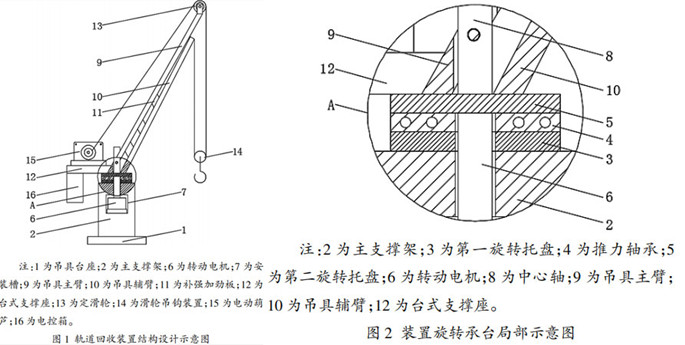 主支撐架的上部設(shè)有帶轉(zhuǎn)動(dòng)電機(jī)安裝槽,轉(zhuǎn)動(dòng)電機(jī)的輸出端依次貫穿安裝 槽的上側(cè)壁、推力軸承和第一旋轉(zhuǎn)托盤(pán)與帶中心軸的 第二旋轉(zhuǎn)托盤(pán)固定連接。中心軸上固定連接有包括吊具主臂和吊具輔臂的吊具臂,吊具主臂與中心軸通過(guò)螺栓固定連接,吊具主臂和吊具輔臂之間設(shè)有若干補(bǔ)強(qiáng)加勁板。吊具主臂的一側(cè)設(shè)有上端帶電動(dòng)葫蘆臺(tái)式 支撐座和定滑輪,吊具輔臂的一側(cè)設(shè)有滑輪吊鉤裝置,電動(dòng)葫蘆的鋼絲繩端依次貫穿定滑輪和滑輪吊鉤裝置 后與吊具輔臂的上端固定連接,滑輪吊鉤作用在待回收的軌道上通過(guò)電動(dòng)葫蘆和鋼絲繩作用定滑輪,使得 滑輪吊鉤對(duì)待回收軌道進(jìn)行提吊拖拉,通過(guò)旋轉(zhuǎn)電機(jī)能夠驅(qū)動(dòng)第二旋轉(zhuǎn)托盤(pán)及與其相連接的吊具臂旋轉(zhuǎn),待回收軌道提拉旋轉(zhuǎn)至合適位置后,將待回收軌道放置于軌道運(yùn)輸平車(chē)上,完成鋼混橋梁的架橋機(jī)軌道回收。臺(tái)式支撐座的下端設(shè)電控箱,通過(guò)電控箱對(duì)電動(dòng)葫蘆和轉(zhuǎn)動(dòng)電機(jī)進(jìn)行控制,電控箱分別與電動(dòng)葫蘆和轉(zhuǎn)動(dòng)電機(jī)電性連接。電控箱的表面設(shè)有防腐涂層,通過(guò)防腐涂層能夠讓電控箱在施工現(xiàn)場(chǎng)的較差環(huán)境中具有更長(zhǎng)的使用壽命。吊具臺(tái)座的底部設(shè)有防滑墊,通過(guò)防滑墊能夠讓本裝置在使用時(shí)更加穩(wěn)定。吊具臺(tái)座的內(nèi)部設(shè)有重力塊,通過(guò)重力塊能夠讓本裝置在使用時(shí)更加穩(wěn)定。