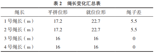 (2)就位狀態(tài)繩長(zhǎng)計(jì)算:使用設(shè)計(jì)軟件TEKLA,對(duì)就位位形狀態(tài)進(jìn)行模擬,通過(guò)重心不變?cè)?,做重心垂線,使所有繩子交于一點(diǎn),測(cè)量出每個(gè)繩子的長(zhǎng)度。如表2所示,整個(gè)位形轉(zhuǎn)換過(guò)程中,1號(hào)和2號(hào)繩長(zhǎng)是不變的,3號(hào)和4號(hào)可調(diào)繩長(zhǎng)需要伸長(zhǎng)5.5m,所以5.5m就是手拉葫蘆需要調(diào)節(jié)的長(zhǎng)度。