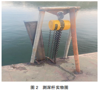 5、放置測深桿:將測深桿放置于船頭船舷位置,用起錨艇吊起掃床架,脫離掃床船后緩慢放入水中,直至測深桿自然垂直于河床面。