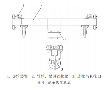 4)相較傳統(tǒng)葫蘆起升裝置可不設(shè)置重錘限位。起吊裝置總成上的水平輪裝置在葫蘆架矩形管導(dǎo)軌上運行,當(dāng)徑向水平輪裝置運行至葫蘆支座下矩形管處時,導(dǎo)向輪與葫蘆架矩形管底面接觸停止,防止沖頂,有效提高了起升上極限約 200 mm。