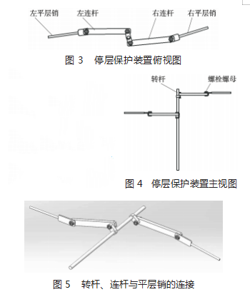 經(jīng)分析,升降機(jī)所用停層保護(hù)裝置為轎廂左、右兩 側(cè)的平層銷。該平層銷采用一套連桿裝置,通過轉(zhuǎn)桿的 轉(zhuǎn)動(dòng)帶動(dòng)左、右兩側(cè)的連桿,再由連桿帶動(dòng)兩側(cè)的平層銷伸出或收回(圖 3、圖 4)。