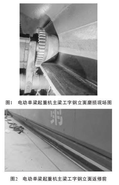 下面是檢驗(yàn)過程中發(fā)現(xiàn)的電動(dòng)單梁起重機(jī)主梁工字鋼立面磨損圖片(見圖1),以及吊至地面準(zhǔn)備返修前的圖片(見圖2)。主梁工字鋼磨損常見表現(xiàn)形式為立面磨損出金屬光澤。