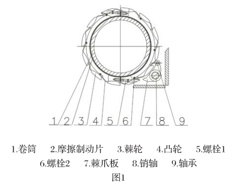 安全制動(dòng)器的整體結(jié)構(gòu)如圖1所示。主要是一個(gè)棘輪機(jī)構(gòu)構(gòu)成,棘輪機(jī)構(gòu)由棘輪組件和棘爪組件組成,棘輪組件安裝在電動(dòng)葫蘆的卷筒上,棘爪組件安裝在葫蘆外殼上。