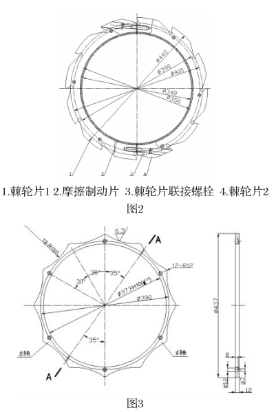 棘輪組件主要包括兩塊棘輪片、摩擦片、凸輪、聯(lián)接螺栓。兩塊棘輪片是兩個(gè)半圓形,用聯(lián)接螺栓鏈接起來合成一個(gè)整棘輪,壓緊摩擦片緊固在卷同上,調(diào)節(jié)聯(lián)接螺栓的松緊,可以調(diào)節(jié)摩擦片制動(dòng)摩擦阻力的大小。棘輪四周均勻分布12個(gè)輪槽和12個(gè)凸起,并均勻鉆有6個(gè)螺栓孔,用與凸輪聯(lián)接,如圖2所示。凸輪主要用來拔動(dòng)棘爪上的軸承,其上均勻分布12個(gè)凸起,四周也均勻鉆有6個(gè)螺栓孔,用螺栓將凸輪緊固在棘輪片上并使凸輪的凸起與棘輪的輪槽保持適當(dāng)?shù)木嚯x,如圖3所示。