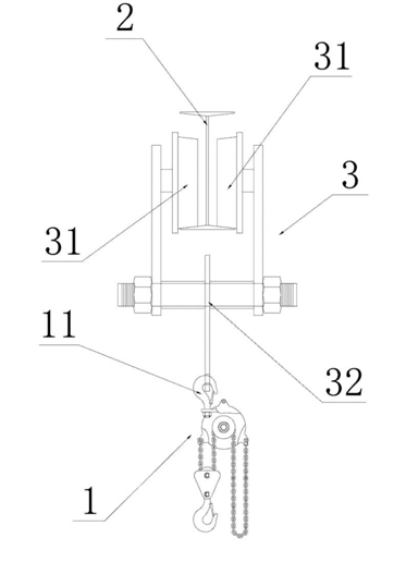 移動式手拉葫蘆包括手拉葫蘆本體1、導(dǎo)軌2和滑行小車3;所述滑行小車3包括卡裝于導(dǎo)軌2內(nèi)的滾輪31和與滾輪31的輪架固定連接的安裝支架32,所述安裝支架32位于導(dǎo)軌2的下方;手拉葫蘆本體1的上吊鉤11安裝在安裝支架32的下端。其中,所述導(dǎo)軌2為工字鋼;所述滑行小車3設(shè)有偶數(shù)個滾輪31,所說滾輪31呈兩列式排列,兩列滾輪31分別卡裝在工字鋼的兩側(cè)部。所述滑行小車3還設(shè)有推拉把手或手拉鏈。使用狀態(tài):導(dǎo)軌2固定安裝在天花板,根據(jù)實際需要,導(dǎo)軌可以是直的,也可以是彎曲延伸的;除了可選用常見的工字鋼外,還可以選用其他形狀的導(dǎo)軌?;行≤?的滾輪31數(shù)量也可以只設(shè)一個,只需能穩(wěn)固地安裝到導(dǎo)軌2內(nèi),工作時不掉落即可。
