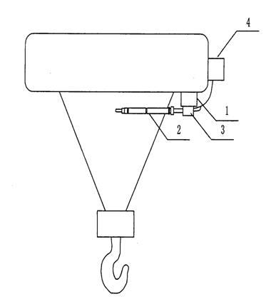 當(dāng)電動(dòng)葫蘆吊鉤懸掛的物體上升至開(kāi)關(guān)探針的檢測(cè)范圍之內(nèi),開(kāi)關(guān)探針就能檢測(cè)到物體的位置信息,所述報(bào)警檢測(cè)裝置2通過(guò)報(bào)警啟動(dòng)開(kāi)關(guān)3與報(bào)警裝置4電連接起來(lái),所述報(bào)警裝置4為聲音報(bào)警裝置或燈光報(bào)警裝置,當(dāng)開(kāi)關(guān)探針檢測(cè)到物體的位置信息后,傳輸?shù)絾?dòng)開(kāi)關(guān)3中,從而啟動(dòng)報(bào)警裝置4,報(bào)警裝置4通過(guò)聲音或燈光將信息傳輸給工作人員,以便于引起他們的注意,防止電動(dòng)葫蘆因過(guò)度上升而碰撞損壞,有效地保證電動(dòng)葫蘆的安全使用。