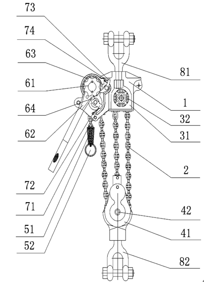 備注:下圖為適合高空作業(yè)的手扳葫蘆主視圖,主殼體--1,鏈條--2,第一殼體--31,定滑輪--32,第二殼體--41,動滑輪--42,緩沖彈簧--51,止退環(huán)--52,手輪--61,棘輪手柄--62,大棘輪--63,倒順棘爪--64,制動棘爪--71,第一收縮彈簧--72,防逆棘爪--73,第二收縮彈簧--74,上吊環(huán)--81,下吊環(huán)--82。