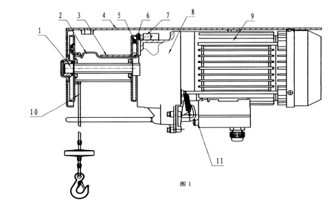 目前電動(dòng)葫蘆上使用的上、下限位保護(hù)裝置一般用于單層繞線(xiàn)技術(shù)的大中型電動(dòng)葫蘆上,上、下限位開(kāi)關(guān)安裝在機(jī)器兩側(cè)或者偏中間的位置;電動(dòng)葫蘆工作時(shí),鋼絲繩上下運(yùn)行帶動(dòng)排線(xiàn)器,再由排線(xiàn)器帶動(dòng)限位桿左右移動(dòng),當(dāng)移動(dòng)到上、下限位開(kāi)關(guān)處時(shí),限位桿上的碰塊壓下上、下限位開(kāi)關(guān)的觸頭來(lái)實(shí)現(xiàn)上、下限位的目的;由于單層排線(xiàn)結(jié)構(gòu)導(dǎo)致電動(dòng)葫蘆繩筒體積變大、變長(zhǎng)。