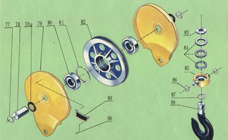 北京凌鷹電動葫蘆吊鉤部件有兩種形式:(1)一只滑輪的單輪式,適用于纏繞鋼絲繩為兩支(2/1出繩)的起升機構(gòu)上;兩只滑輪的雙滑式,適用于纏繞鋼絲繩為四支(4/2或4/1出繩)的起升機構(gòu)上。吊鉤組:符合起重吊鉤GB/T1005.1~5-98標準,材質(zhì)為DG20,安全系數(shù)大于5;吊鉤表面光潔無裂紋、折疊、過燒等缺陷;內(nèi)部無裂紋、白點和其他影響使用安全的夾雜物等其他缺陷。吊鉤帶有防止鋼絲繩脫鉤的防脫鉤裝置。確保吊鉤在使用過程中的安全可靠性。