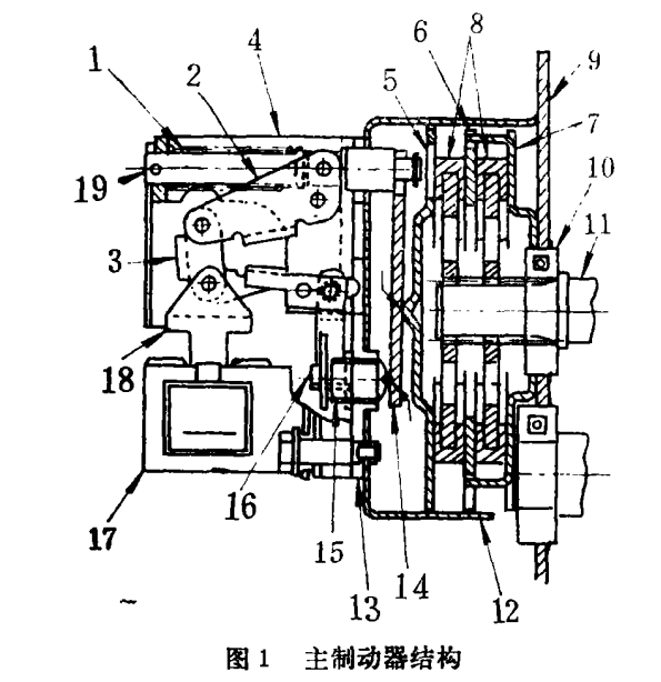 備注:1為壓力彈簧,2、3為連桿A、B,4為彈簧壓板,5/6/7為制動盤A/B/C,8為制動輪,9為機架,10為軸承,11為一級軸齒輪,12,13為制動電磁鐵支架A、B,14為制動器杠桿,15為調(diào)整螺釘,16為調(diào)整杠桿,17為固定鐵心,18為可動鐵心,19為制動桿。
