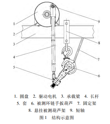 環(huán)鏈?zhǔn)职夂J需要懸掛在規(guī)定工位上,將驅(qū)動裝置的電機(jī)以一定角度和一定距離固定在懸掛環(huán)鏈?zhǔn)职夂J的承載梁上, 角度要求電機(jī)輸出軸與環(huán)鏈手扳葫蘆的操作手柄相垂直, 距離要求安裝完驅(qū)動裝置后不發(fā)生干涉。在固定好驅(qū)動電機(jī)后,在電機(jī)輸出軸上安裝一個周邊焊有小短軸的圓盤,在小短軸上通過關(guān)節(jié)軸承連接一根長桿(長桿可分為幾段,相互通過螺紋扣連接,方便調(diào)節(jié)距離,關(guān)節(jié)軸承可以調(diào)整角度),在長桿的另一端通過螺紋扣連接一個套 (套可以靈活轉(zhuǎn)動) ,通過該套與環(huán)鏈?zhǔn)职夂J的操作手柄進(jìn)行連接,見圖1進(jìn)行試驗時,首先接通電源,電機(jī)帶動安裝在輸出軸上的圓盤做圓周運動,圓盤上的短軸帶動長桿以電機(jī)輸出軸為中心進(jìn)行上下擺動,這樣,環(huán)鏈?zhǔn)职夂J的手柄在長桿上連接套的帶動下一起上下擺動,從而實現(xiàn)重物上升、下降的動作。為了避免在進(jìn)行試驗時環(huán)鏈?zhǔn)职夂J的轉(zhuǎn)動,可以在承載環(huán)鏈?zhǔn)职夂J的梁上焊接一固定支架,通過支架將環(huán)鏈?zhǔn)职夂J的相對位置固定好, 從而實現(xiàn)更好,更有效的操作。
