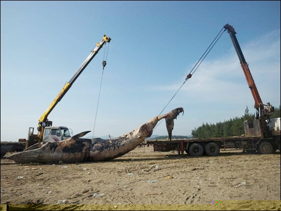 據(jù)報(bào)道,當(dāng)?shù)貢r(shí)間5月28日。越南義安省,當(dāng)?shù)睾┏霈F(xiàn)一條死因不明的鯨魚尸體。民眾用兩臺(tái)隨車起重機(jī)協(xié)作將龐大的巨鯨尸體運(yùn)離。