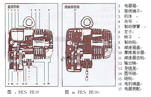 PK型環(huán)鏈電動葫蘆減速機(jī)構(gòu)采用二級(PK1、PK2)或三級外嚙合直齒圓柱齒輪傳動。齒輪和齒輪軸經(jīng)熱處理、表面強(qiáng)化處理,綜合性能好。它們安裝在密封式的減速箱體內(nèi),采用齒輪油潤滑。在第二級傳動齒輪上裝有一個安全離合器(見下圖),它由傳動齒輪、摩擦環(huán)(片)、碟形彈簧以及中壓板和調(diào)速螺母等組成。通過調(diào)整螺母可調(diào)整安全離合器內(nèi)的摩擦力矩,使葫蘆在額載時能正常運(yùn)轉(zhuǎn),并在超載至極限時出現(xiàn)卡鏈或吊鉤運(yùn)行極限位置時,摩擦面產(chǎn)生滑動,對葫蘆機(jī)構(gòu)起保護(hù)作用。